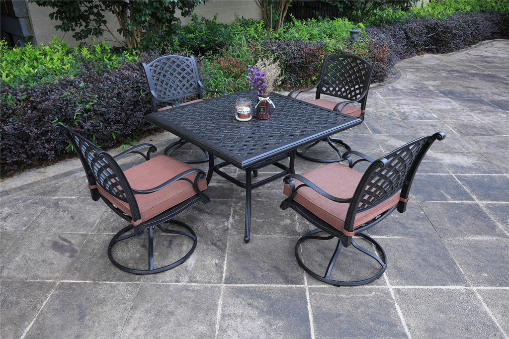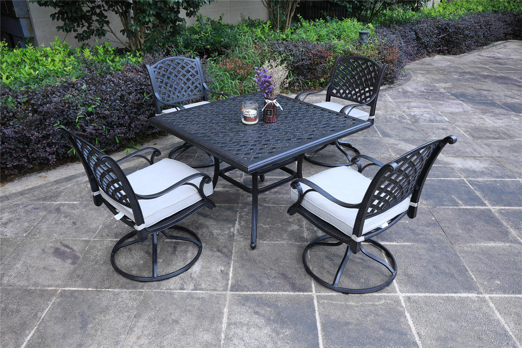It is with great pleasure that we now present to you a true iPatio classic. Our Sparta 5 piece set. Inspired by the power and excellence of Spartan design, this bold beauty has been carrying the torch of iPatio since 2017. With this set, you'll receive 4 Sparta cushioned swivel dining chairs and one of our standard square 44 inch Sparta tables. -- In all, you'll have just the right amount of hardware for throwing amazing backyard family dinners or for entertaining your closest group of friends. We just know you're gonna love this table!